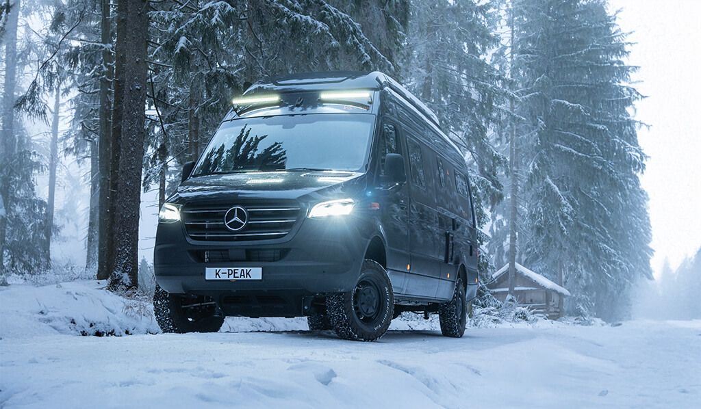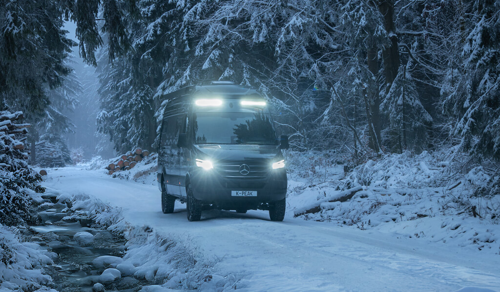 - Uniquement dans l’édition K-peak : encore plus d’autosuffisance de série, par ex. grâce à une batterie lithium de 320 Ah, à des panneaux solaires de 100 W, à des phares LED supplémentaires, une boîte automatique à 9 rapports, un chauffage diesel