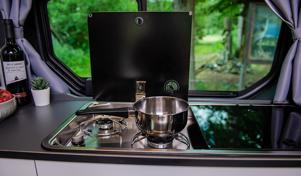 Kochen kannst du entspannt auf dem großen 2-Flammkocher – abspülen bequem in der Spüle mit Wasserhahn nebenan